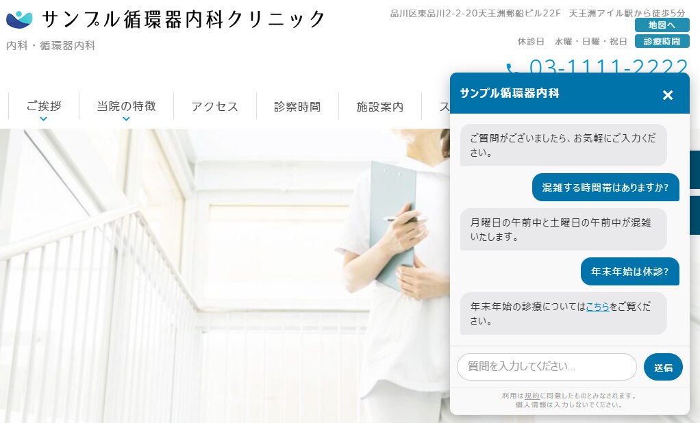 これらの質問に対して、チャットボットはホームページ内のお知らせページや診療内容ページに自動で誘導してくれます。