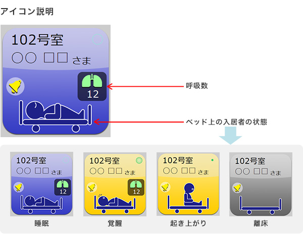 - 睡眠中に入居者の状態に変化があった場合はその情報がタブレットに通知され、体調変化の早期発見ができます。
