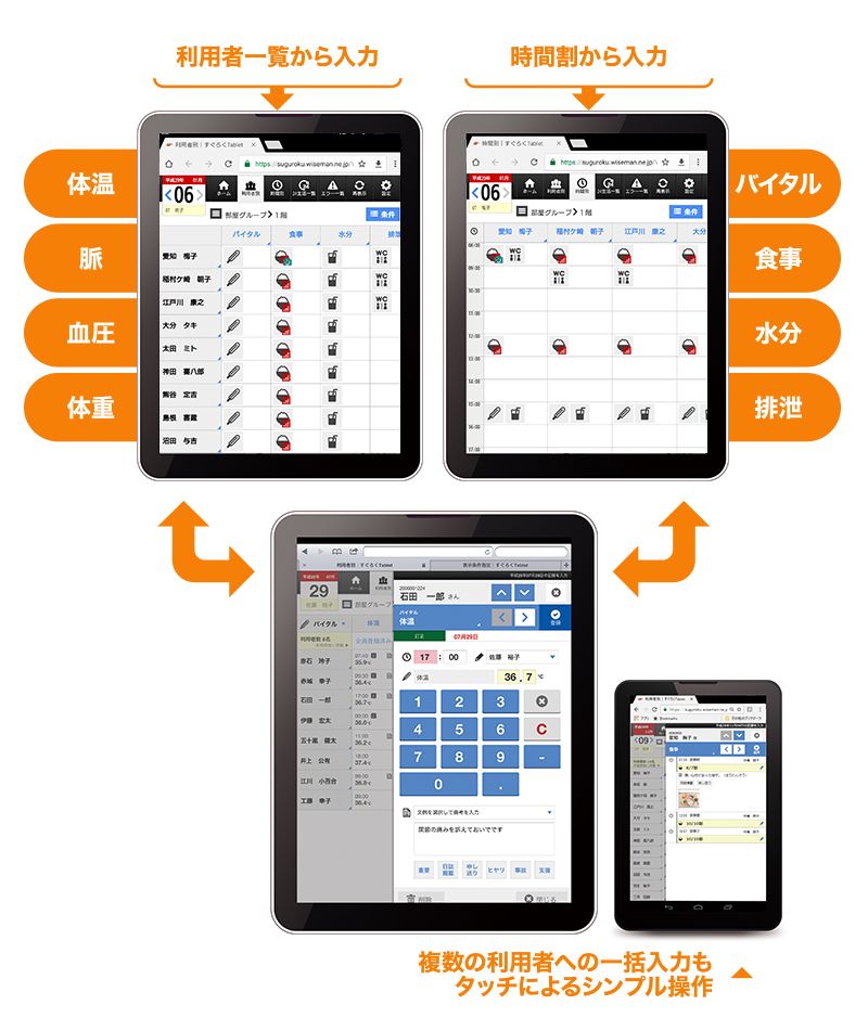 - 簡単入力で記録に掛かる時間を短縮。タブレットなのでスマートフォンと同じ感覚で指1本で操作ができます。パソコンが苦手なスタッフはパソコンを操作することはありません。